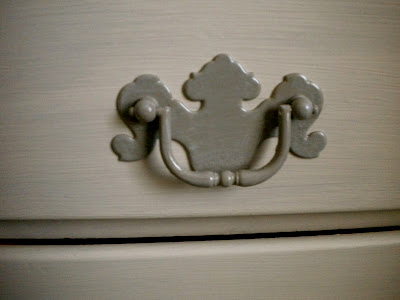 I didn't sand or prep really at all (I never do) and just got down to work. After removing the hardware the drawers got two good coats of white paint as well as the entire desk except the top. The top was a bit more complicated. It had a thick hard top of acrylic gel and I had already tried to pry it up with no luck. I also knew that sanding the entire thing down would take literally hours. I ended up just hand sanding the top for a few minutes, just enough to scratch it up and give the paint something to grip on to. The paint covered most of the stained wood but I also left a little peaking through to give it that weathered look. After the paint was dry, I used a gray glaze all over it. Not gonna lie, it looked fabulous. The hardware got a few coats of gray spray paint and the gray glaze over that then got reattached.